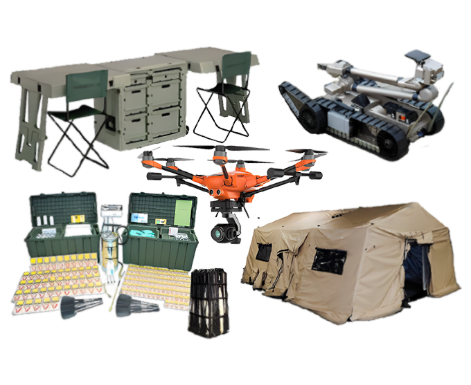 Rapid deployment shelters provide decontamination, housing, and dining in emergencies. Mobile field desks are portable desks for use in the field, including for command and control, communication, and data management. Field sanitation kits contain supplies for maintaining cleanliness and hygiene in the field. Search and rescue robots and drones can search for and rescue people in hazardous or difficult-to-access environments. These additional pieces of equipment can be carried on emergency response trailers for various emergency situations.